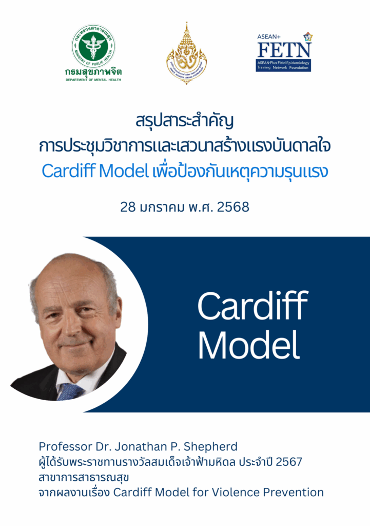 Home ASEAN-Plus Field Epidemiology Training Network Foundation มูลนิธิเครือข่ายฝึกอบรมระบาดวิทยาภาคสนามอาเซียน Summary of Special Academic Meeting: The Cardiff Model for Violence Prevention For more details, please click the link below. E-book (TH) PDF (TH) Youtube (EN/TH) Past Events Special Academic Meeting: The Cardiff Model for Violence Prevention On 28 January 2025, Srithanya Hospital, Nonthaburi, Thailand and Tele VDO Conference.